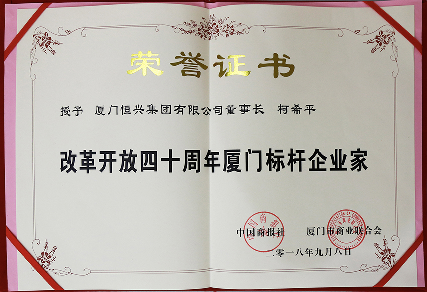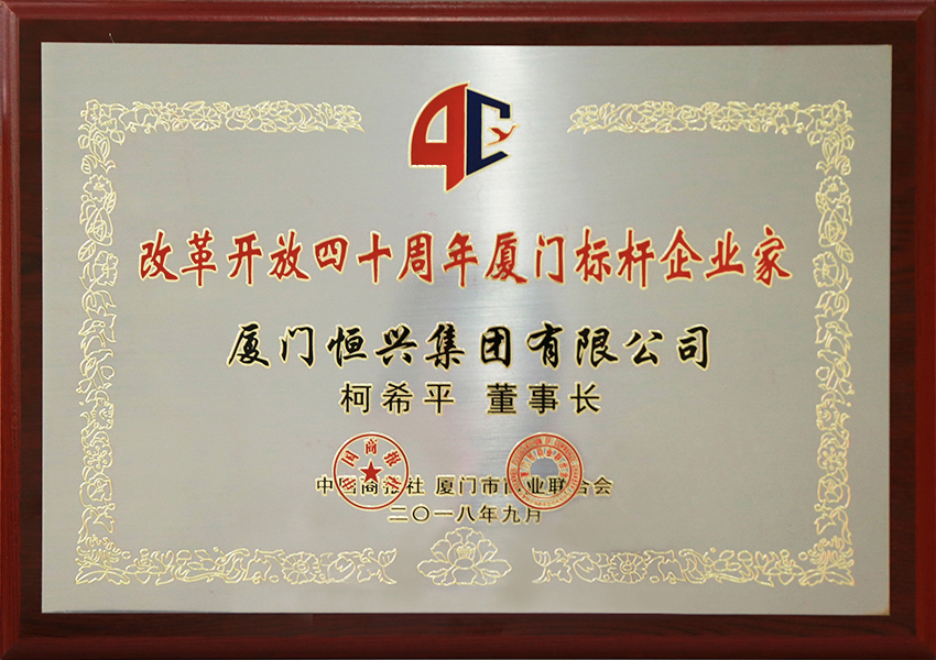 金秋迎盛會,改革促發(fā)展。9月8日,在第二十屆中國國際投資貿易洽談會開幕之際,中國商報社、廈門市商業(yè)聯(lián)合會攜手主辦的“改革開放四十周年廈門標桿企業(yè)家、創(chuàng)業(yè)精英、助力品牌、創(chuàng)新品牌”推選活動在廈門舉行頒獎儀式,61家企業(yè)家和品牌獲得殊榮。廈門恒興集團柯希平董事長榮獲“改革開放四十周年廈門標桿企業(yè)家”榮譽稱號。